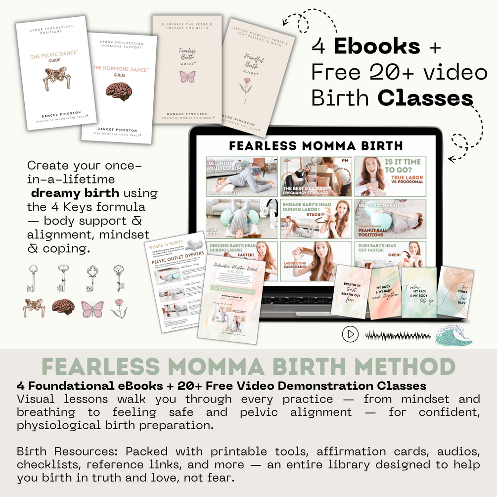 The Fearless Momma Birth Method® is a comprehensive preparation method that brings together four foundational guides. Rooted in love and truth, this method teaches mindfulness, safety, and trust—supporting your birth hormones, pelvic balance, and subconscious peace. Designed to help you release fear, align your body, and prepare for the birth you were created for.